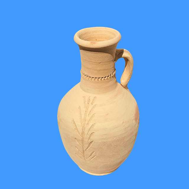 Handgemachter Tonkrug aus Saudi-Arabien aus reinem und besonders hochwertigem Kaolin Ton, der sich durch seine cremig-hellbeige Färbung auszeichnet und aus Wüstensand der Provinz Medina in Saudi-Arabien gewonnen wird. Die natürlich belassene Oberfläche und Haptik unterstreicht die Fertigung aus reinem, unbehandeltem Wüstensand. Aufgrund ihrer bauchigen Form kann sie als Vase oder als Krug genutzt werden und charmant indoor wie outdoor zum Einsatz kommen (Terrasse, Tische, Sideboard). Unsere Objekte können Unregelmäßigkeiten, Imperfektionen und Oberflächenunterschiede aufweisen. Alle Modelle werden ohne Elektrizität von Hand gedreht und bei 1000 Grad Celsius unter freiem Himmel nach traditioneller Art gebrannt.