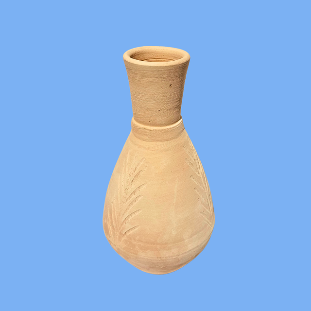 „Nakhla“ ist eine handgeformte Tonvase mit eingraviertem Palmenblatt. Sie gehört zu einer limitierten Sommerkollektion und wurde aus regionalem, hochwertigem Kaolin-Ton gefertigt, dessen helle Sandfärbung auf den Ursprung in der Wüste bei Medina verweist. Die sandige, warme Oberfläche wirkt unbehandelt und naturbelassen – ein bewusster Kontrast zur glattpolierten Industriekeramik.